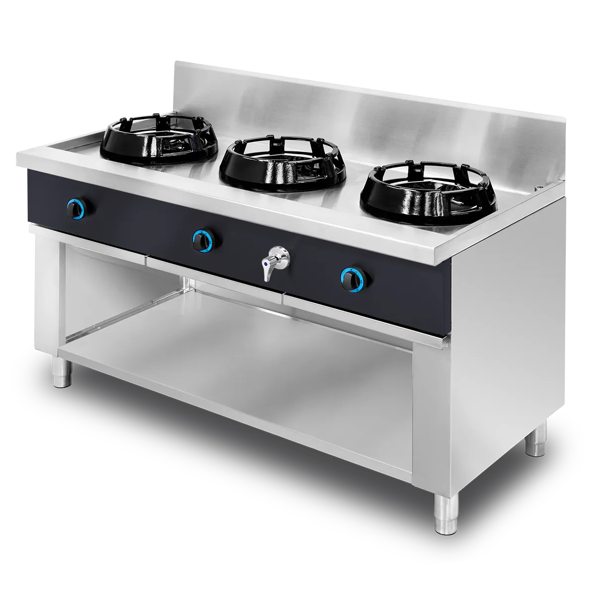 La solidez de la estructura soldada garantiza una estabilidad total ante movimientos intensos del wok, característica imprescindible para cocinas asiáticas profesionales.
